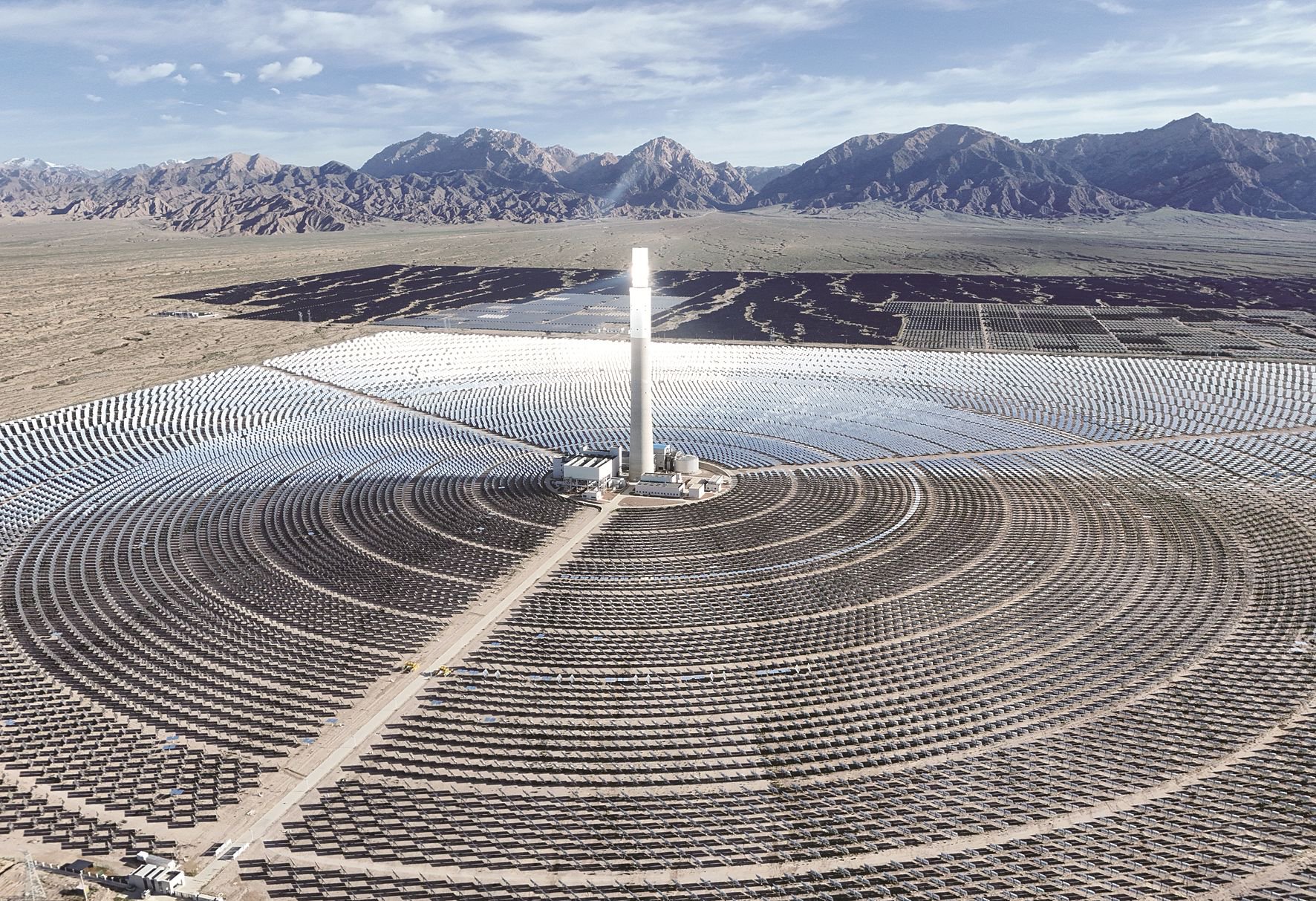 青海省海西蒙古族藏族自治州依托得天独厚的光照及土地资源,加快清洁能源产业布局,尤其是德令哈市成功打造国内首座规模化塔式熔盐储能光热发电项目和国内首个并网投运的大型商业化槽式光热发电项目。图为青海德令哈市中控太阳能光热发电场。