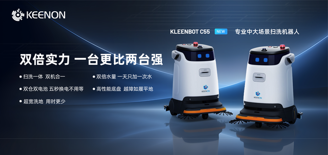 本次发布的清洁机器人C55,专为3000㎡以上大型室内空间设计,集扫、洗、吸功能于一体,核心优势体现在四个方面: