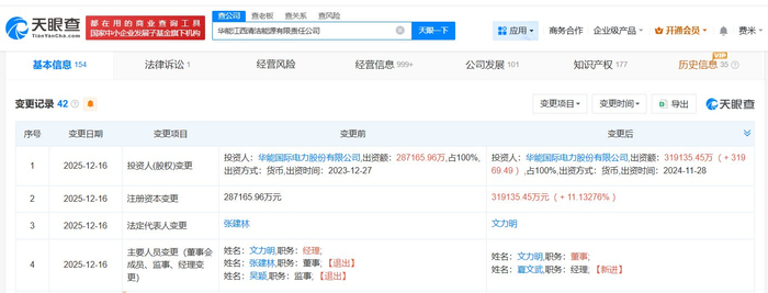 雷达财经讯,天眼查App显示,近日,华能江西清洁能源有限责任公司发生工商变更,注册资本由约28.7亿人民币增至约31.9亿人民币,增幅约11%,张建林卸任法定代表人,由文力明接任,同时部分高管发生变更。