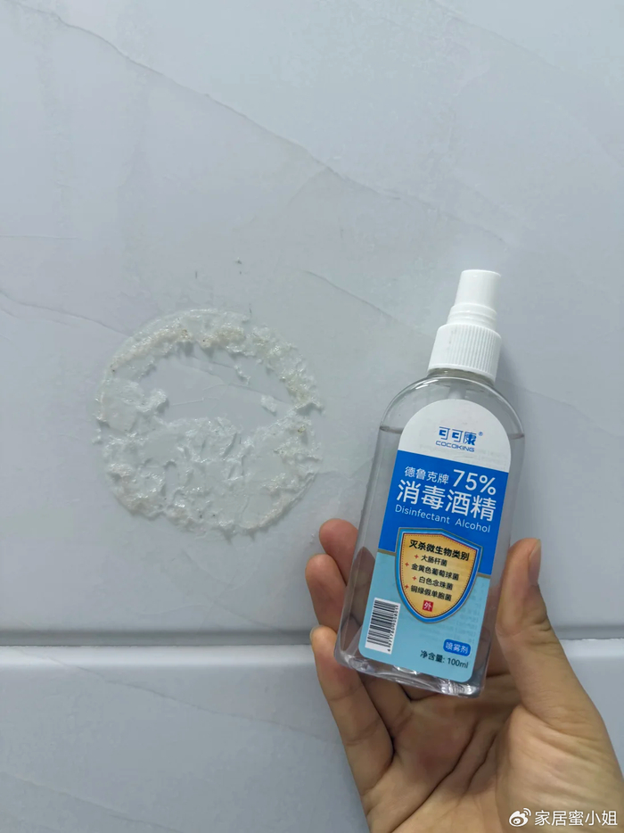 ②祛胶迹:家里的墙上难免会有一些胶迹,之前买了一瓶去胶剂,胶去不下去不说,屋里还有很大的味道,于是想到家里还有酒精,