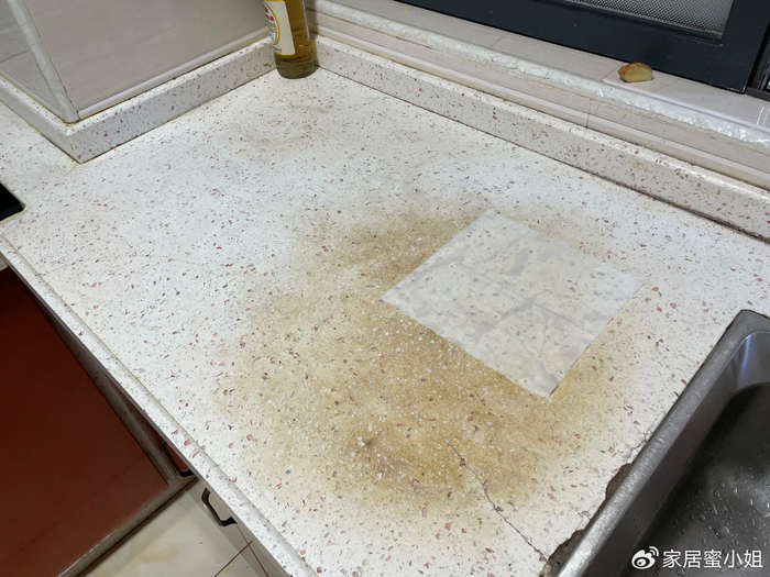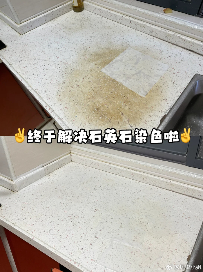 ②石英石渗色:石英石就特别容易渗色,哪怕是花盆、水果放在上面,不小心就把颜色渗进去了,要是不知道怎么处理,颜色真的很影响石英石颜值。