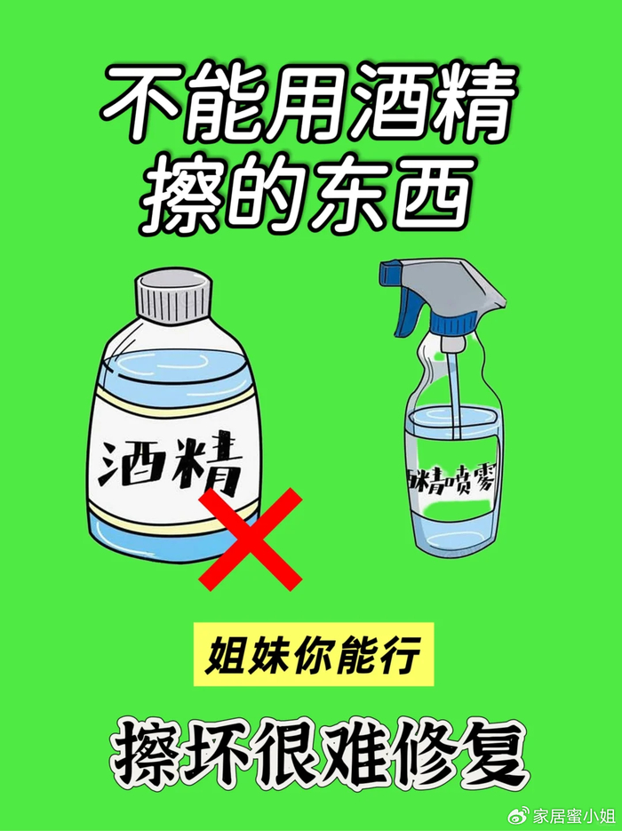 家里有些东西不能用酒精擦拭,比如真皮沙发,电脑、液晶电视屏幕、亚克力材质家具、皮包、防盗门、实木家具等等,毕竟酒精是有机溶液,有些东西会遭到破坏,这个是我们需要注意的!