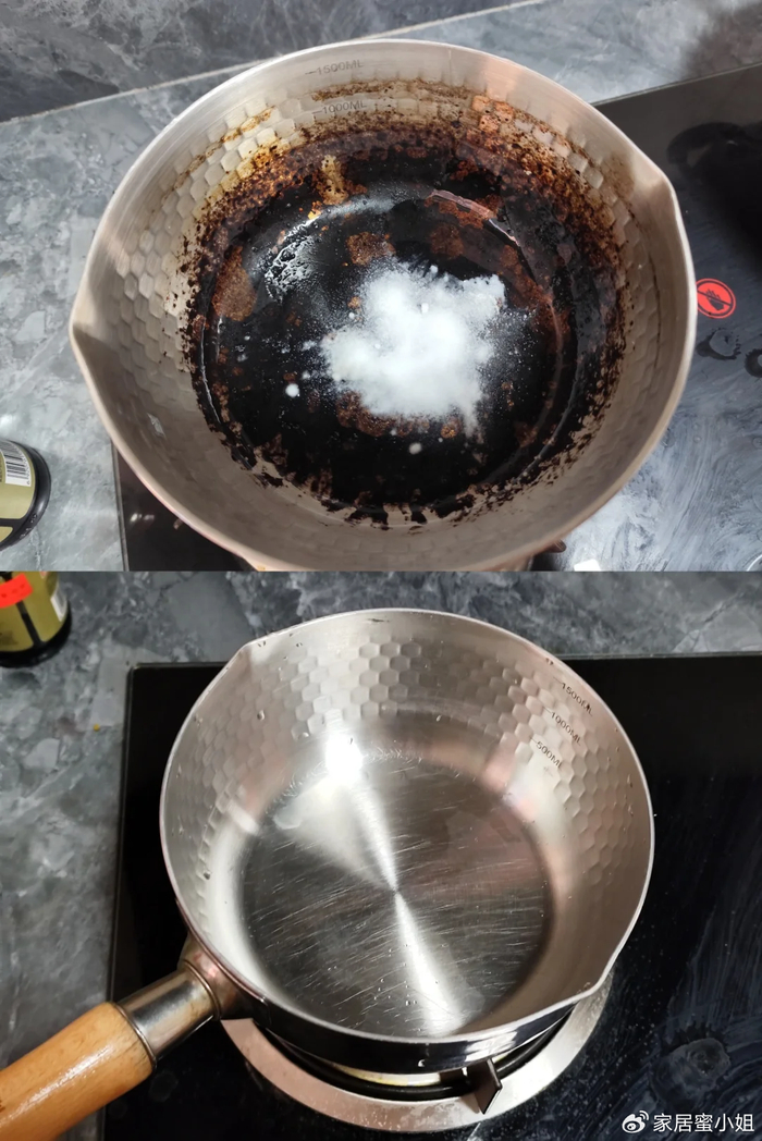 然后一起放到烧糊的锅中,用热水将其融化并浸泡。这时你会发现烧糊的物质被慢慢溶解,然后再正常刷锅就可以了。
