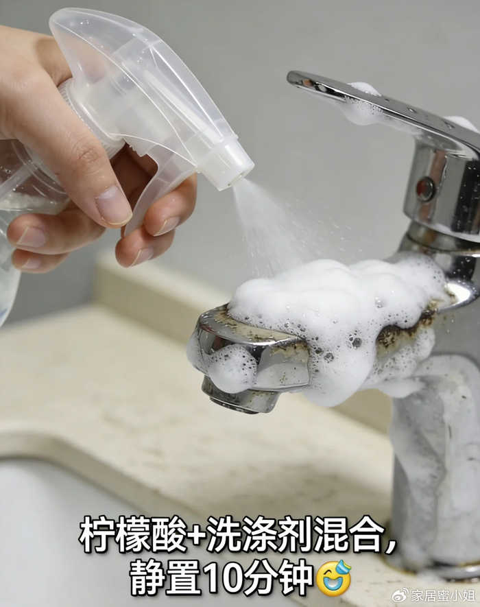我们用柠檬酸+洗洁精,溶解之后放入喷壶里面摇晃均匀,喷洒在花洒上静置半小时。之后只需要轻轻擦拭,然后用清水冲洗就干净了。